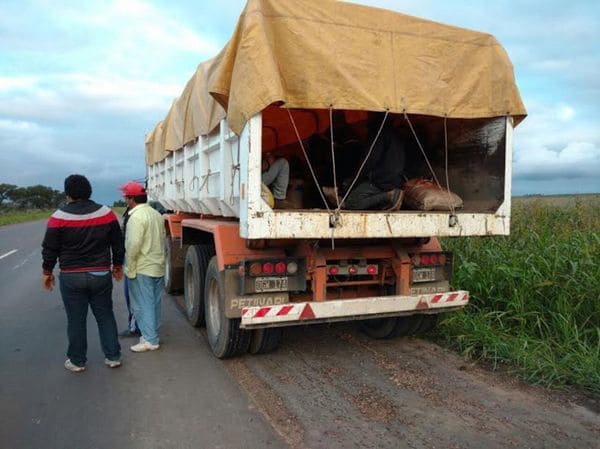 Un camión municipal transportando personas indocumentadas y explotadas. El hecho se registró hoy en la provincia de Chaco. Las personas rescatadas manifestaron ser víctimas de explotación laboral y haber pasado los últimos viente días trabajando a destajo en el desmonte de un campo.