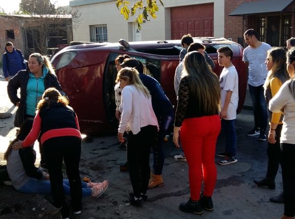 Los vecinos de la calle 7 segunda cuadra, no podían creer lo que observaban. Un auto que se desplazaba por esa cuadra comenzó a zigzaguear y chocó con un cantero, que quedó semidestruido, y luego quedó volcado en medio de la calle. Una vecina, que estaba sentada en una silla en la vereda, a pocos metros de ese cantero, se sorprendió por la maniobra. Los vecinos ayudaron a salir del rodado a una joven pareja. La que llevó la peor parte, con un fuerte golpe en el rostro y en la mano fue la mujer, en tanto que el hombre resultó con golpes leves. A los pocos minutos llegó personal policial y luego la mujer fue trasladada en ambulancia para recibir atención médica en un hospital. Afortunadamente sólo se registraron daños materiales.