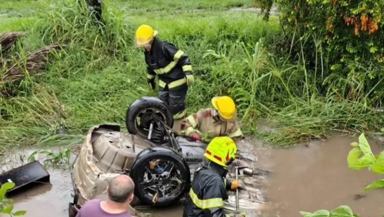 Tras el impacto contra una columna de alumbrado público y posterior vuelco, el auto cayó a un canal de desagüe y quedó con las ruedas hacia arriba. Pronto comenzó a llenarse de agua debido a las intensas lluvias registradas en la zona, lo que puso en riesgo la vida de todos los ocupantes, quienes estaban atrapados sin poder salir por sus propios medios.