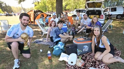 Además de carpas para pasar la noche, los declarados fanáticos de “La Scaloneta” llevaron una Copa del Mundo de tres metros de altura y 180 kilos de peso, que construyeron ellos mismos y que trasladaron hasta el lugar con una grúa. “El armado nos llevó una semana. Tiene una base de acero, hierro torcido y arriba yeso para darle la forma redonda. Lo demás es pintura y revestimiento”, Ojeda.