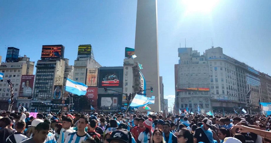 Cientos de miles de hinchas con camisetas de la Selección nacional y banderas se concentran en el Obelisco, en pleno centro porteño, a la espera de los campeones del mundo.
