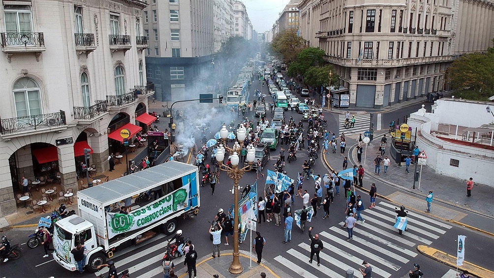 Cientos de camiones, micros, taxis y todo tipo de vehículos marchaban este mediodía en caravana por las calles del centro porteño, entre el Obelisco y la Plaza de Mayo, al celebrarse el Día de la Lealtad peronista y en respaldo de la gestión del gobierno de Alberto Fernández.