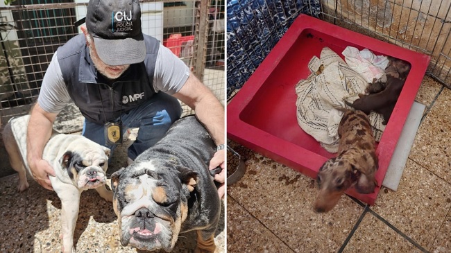 Durante el allanamiento, encontraron 22 perros, entre ellos 10 cachorros, de las razas Bulldog francés, Ovejero alemán y Dachshund, conocido popularmente como “perro salchicha”, que permanecían enjaulados en espacios reducidos.
