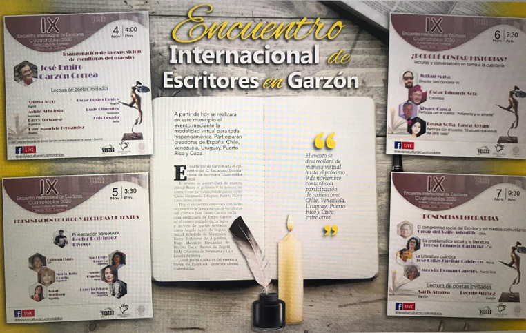 La experiencia vivida durante ocho encuentros anteriores permitió convocar este año al IX Encuentro Internacional de Escritores Cuatrotablas 2020, a realizarse desde hoy al 9 de del corriente mes, desde la sede principal en Garzón Huila, Colombia, mediante la modalidad virtual, para toda Hispanoamérica. Estarán presente invitados de Argentina, España, Uruguay, Chile, Venezuela, Puerto Rico y Cuba.