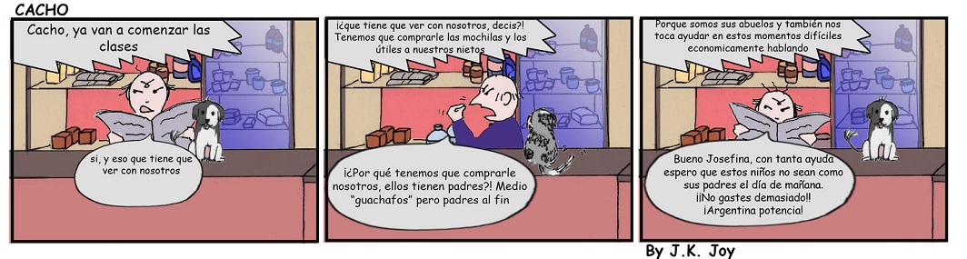 Actualidad Comienzan las clases y Cacho lo sabe 19 febrero, 2026 Compartir en Facebook Compartir en Twitter 🔊 Escuchar la entrada El personaje principal de la tira cómica de Diario Cuarto Poder , Cacho, Creado por J.K. Joy , se enoja ya que no entiende porque deben comprar todo para las clases cuando los nietos tienen padres que deben ocuparse de ello. Comments Comentarios