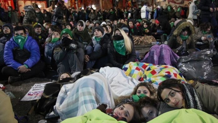 “¡Empanades!”, grita una vendedora sobre la avenida Callao, a una cuadra del escenario montado por la Campaña Nacional por el Derecho al Aborto Legal, Seguro y Gratuito. El guiño al lenguaje inclusivo hace reír a quienes la escuchan. En el cordón de la vereda, un grupo de amigas que llegó desde Lanús repasa el inventario: jarros térmicos, polainas de lana, medias de repuesto y toda la yerba que tenían a mano. “Nos vamos a quedar hasta que se vote, hay que estar en la calle: que los diputados sepan que estamos en la calle”, dice Camila, de 19 años y con las mejillas verde brillante.