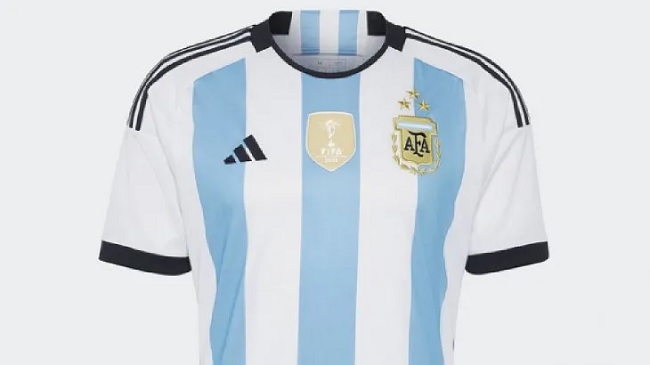 La camiseta contará con el escudo, las 3 estrellas bordadas y además posee el escudo de Campeón del Mundo 2022 de la FIFA.