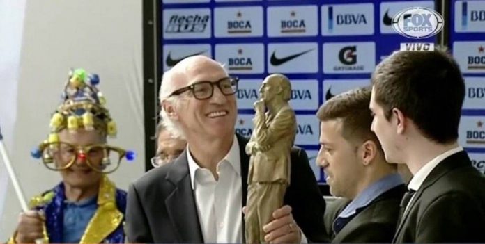 Carlos Bianchi, emocionado, recibe una replica a escala de su estatua.