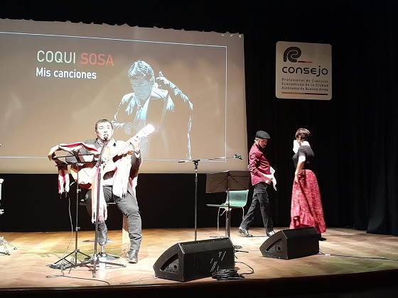 El tucumano fue presentado por el coordinador de la Comisión de Acción Cultural de ese cuerpo colegiado de profesionales, Luis A. Barrera, y sólo acompañado por su guitarra y ataviado con el poncho que nos identifica, comenzó su actuación.