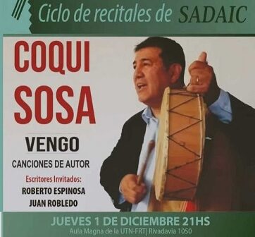 Ciclo de Recitales SADAIC / Música y poesía. Este jueves 1º de diciembre, Coqui Sosa presentará “Vengo, canciones de autor”, en el auditorio de la Facultad Regional Tucumán de la Universidad Tecnológica Nacional (FRT-UTN). Habrá dos poetas invitados.