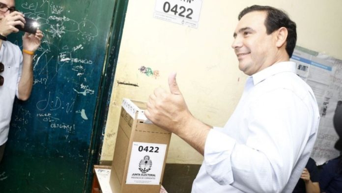 La alianza oficialista Eco-Cambiemos se adjudicó bien temprano, esta tarde, el triunfo en las elecciones correntinas. En su cuenta oficial de Twitter, el frente Encuentro por Corrientes publicó el tuit “Ganó Valdés” junto a una imagen del radical a gobernador Gustavo Valdés junto al candidato a vice de la formula oficialista, Gustavo Canteros. Y los primeros cómputo los ubican arriba: desde que salieron los primeros datos, pasadas las 21, Cambiemos supera los 50 puntos y aventaja claramente al opositor peronista Carlos “Camau” Espínola.