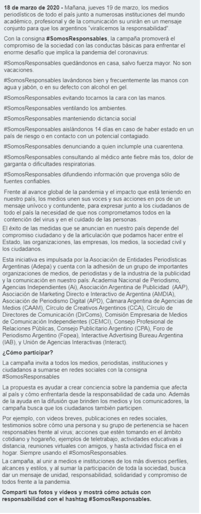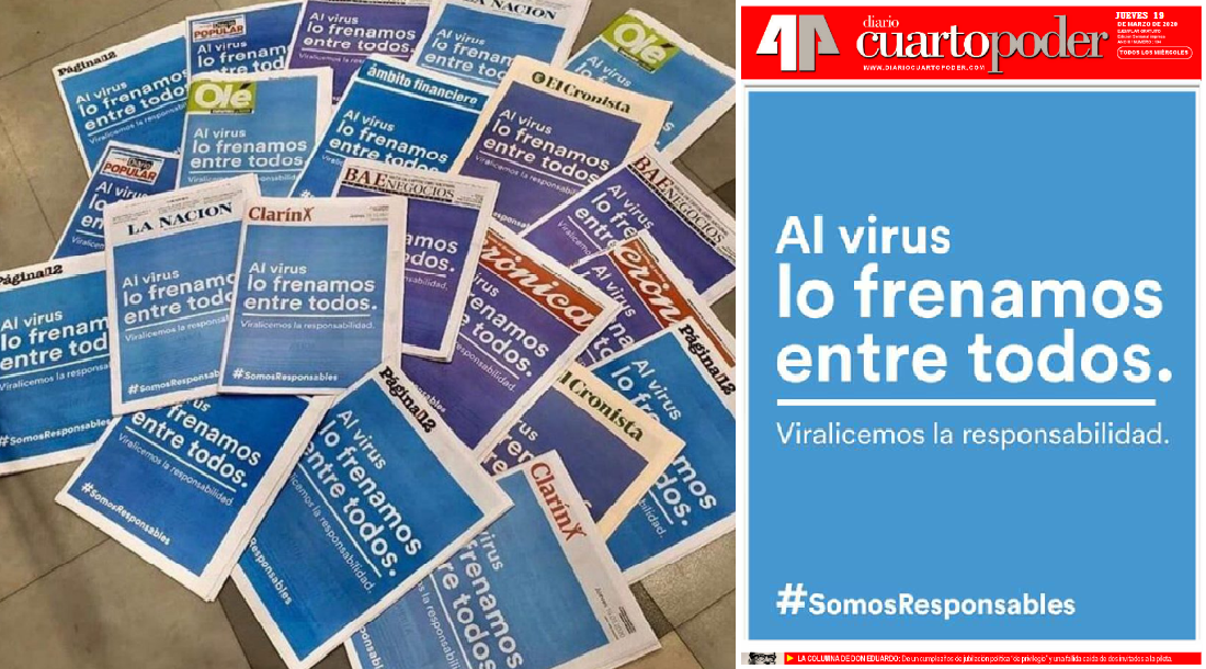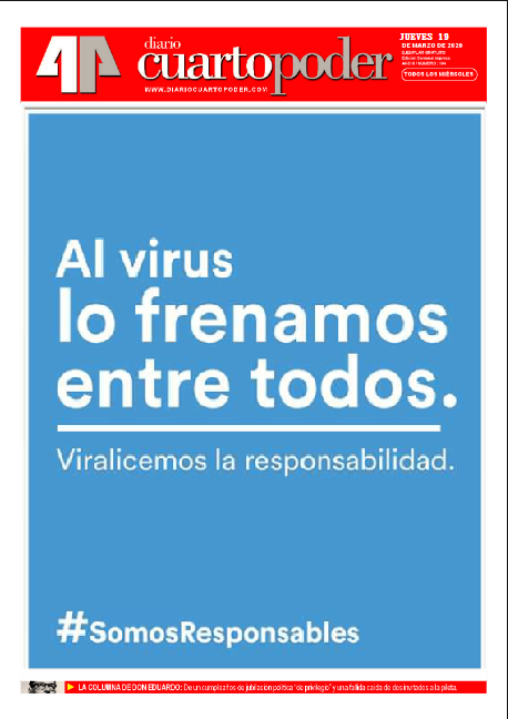 Bajo el lema “Al virus lo frenamos entre todos”, los principales medios gráficos del país se sumaron a la campaña global por un periodismo responsable a la hora de informar sobre la pandemia del Covid-19. Desde Diario CUARTO PODER nos sumamos con nuestra tapa digital para concientizar a nuestros lectores que “Al virus lo frenamos entre todos. Viralicemos la responsabilidad.