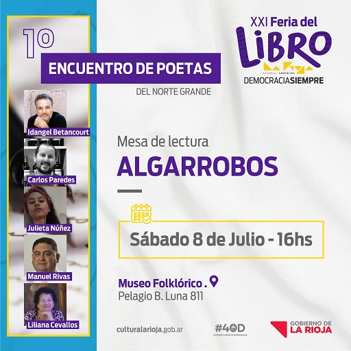 A las 16, iniciará la mesa de lectura “Algarrobos”, de la que participarán los poetas Idangel Betancourt (Catamarca); Liliana Cevallos (Chepes – La Rioja); Manuel Rivas (Tucumán); Carlos Paredes (La Rioja) y Julieta Núñez (Formosa).