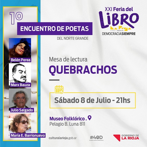 A las 21, tendrá lugar la mesa de lectura “Quebrachos”, con Julio Salgado (Santiago del Estero), Marx Bauzá (Tucumán); María Elena Barrionuevo (Catamarca); Belén Perea (La Rioja) y Yael Guerrero (La Rioja).
