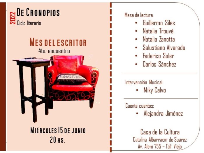 Literatura y música / Mes del escritor. Este miércoles 15 de junio, en la Casa de la Cultura de Tafí Viejo, tendrá lugar el 4° Encuentro del ciclo “De Cronopios”, coordinado por el poeta Gabo Acosta, que incluirá mesa de lectura, música y cuenta cuentos.