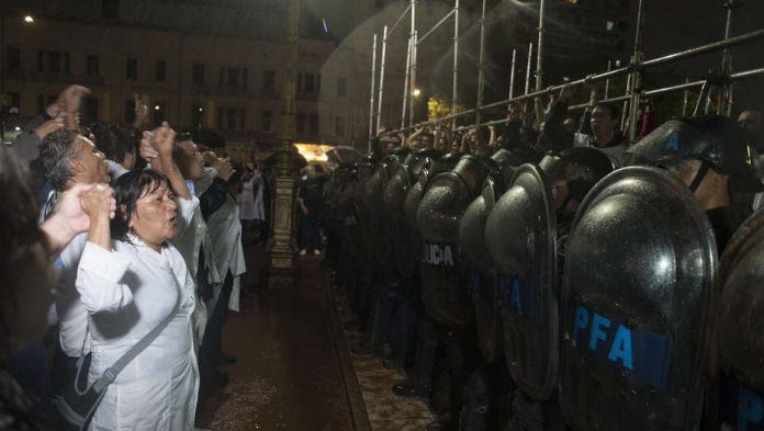 La Policía de la Ciudad dispersó esta noche a los sindicalistas docentes que intentaron instalar una nueva versión de la “Carpa Blanca” frente al Congreso Nacional. Según pudo comprobar Clarín desde el lugar, los uniformados arrojaron gas pimienta y desalojaron a los manifestantes que se resistían al avance de la fuerza de seguridad sobre la estructura tubular con la que se iba a levantar un “aula itinerante”.