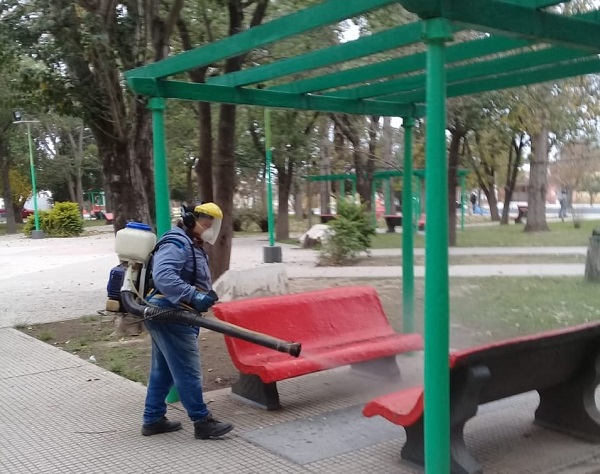Arrancando la jornada de hoy, el Municipio de Trancas, a través de la Dirección de Comercio y Saneamiento Ambiental, realizó un importante trabajo de desinfección en los espacios de uso públicos de nuestra ciudad.