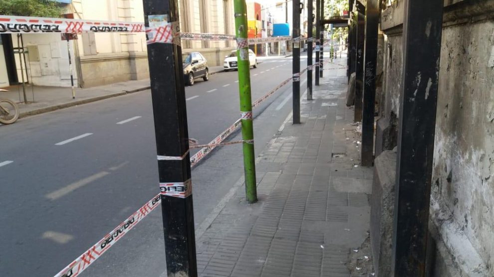 El encintado se hizo sobre los “andamios de fachada“, ubicados desde hace al menos cinco años en la vereda del centenario edificio. Los andamios están instalados pese a que no se realizan trabajos en la parte frontal del inmueble, como una protección adicional ante la posibilidad de algún derrumbe.