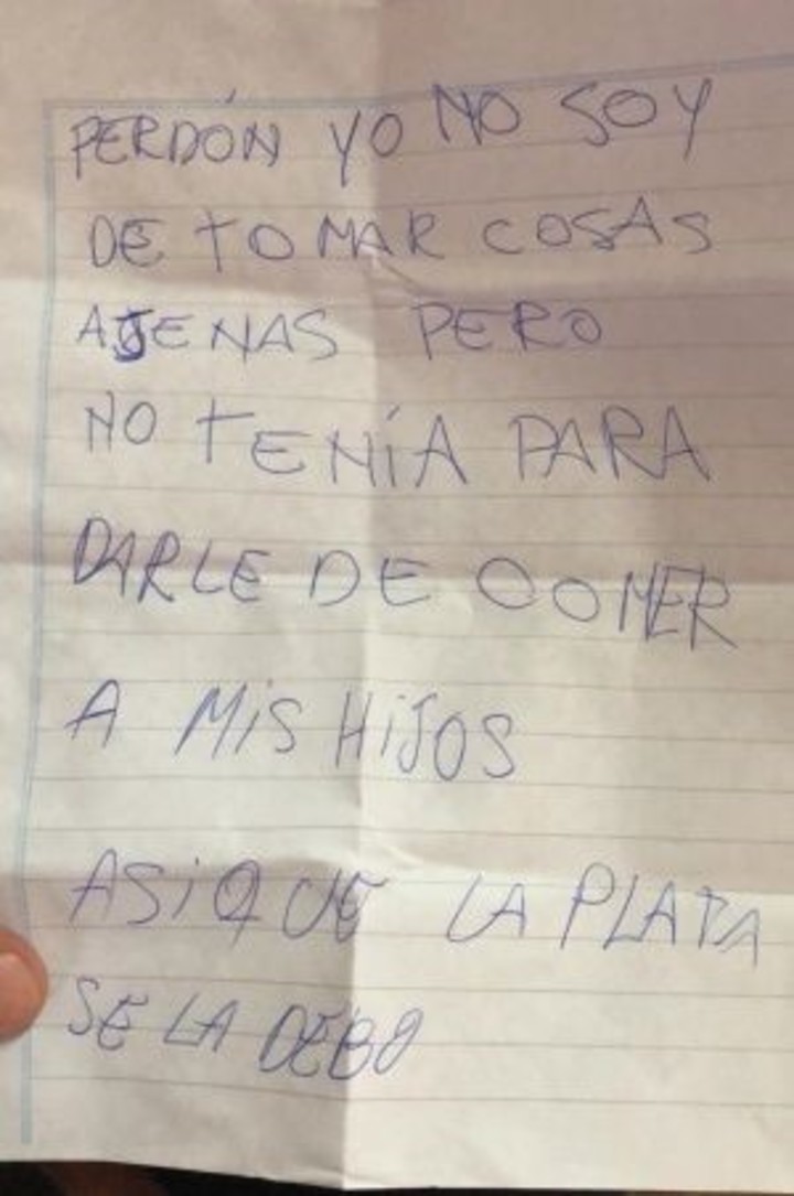 Los trabajadores de la emisora quedaron atónitos cuando revisaron la billetera en busca de alguna documentación que permitiera ubicar al dueño. Se encontraron con un papel escrito a mano con la la frase “Perdón. Yo no soy de tomar cosas ajenas, pero no tengo que darle de comer a mis hijos, así que la plata se la debo”.