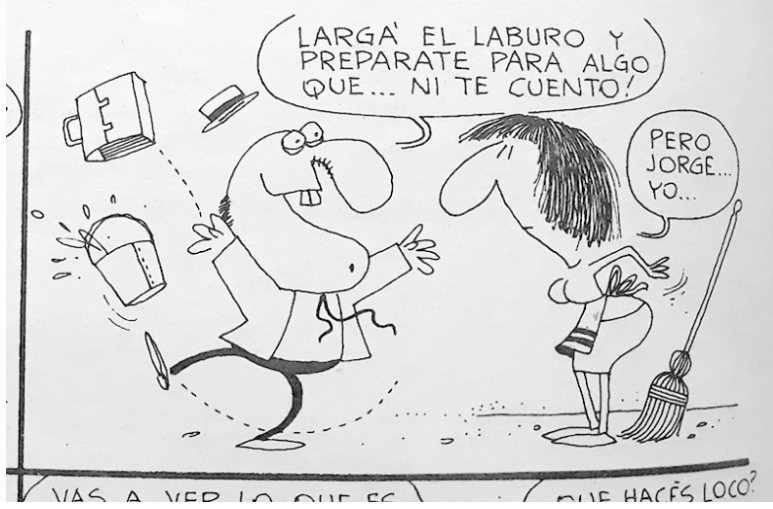 dibujo y le pone un texto y lee solo el texto y se ríe, ¿para qué hace el dibujo? Y si mira el dibujo solo y también se ríe, ¿para qué agregarle un texto, si con el dibujo alcanza? Entonces hay que lograr una mezcla de las dos cosas. Su método constructivo se basa en pensar primero la situación, el escenario, tiene que ser un escenario lindo, decorativo, preguntarse qué hacen los hombre en ese escenario, como una puesta en escena en una obra teatral, con respecto al texto si es posible en una línea dar la sorpresa, para que la secuencia sea ver el dibujo y leer el texto para que la gracias se dé en el final.