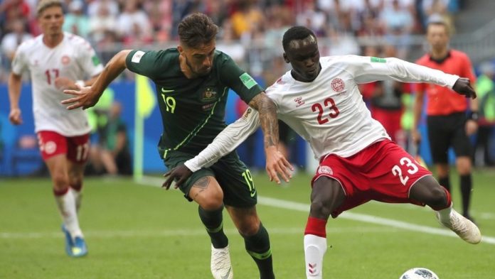 Los australianos fueron más incisivos. Mooy recuperaba la pelota en mitad de cancha, prolongaba a Jedinak y Leckie comenzaba a ganar en lo alto. De un centro desde la derecha, Leckie ganó una vez más de arriba y la pelota dio en el brazo extendido de Poulsen. El VAR (con el estadounidense Mark Geiger a la cabeza) asistió al árbitro español Antonio Mateu Lahoz y el penal fue convertido por el experimentado Jedinak.