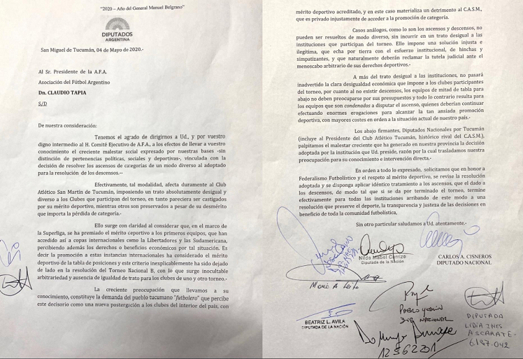 En este contexto, el diputado José Cano difundió a través de sus redes sociales un comunicado el cual fue enviado a la AFA apoyando la postura de Sagra y pidiéndole a Claudio Tapia que aplique el mismo criterio y trato para todos los clubes, incluso escribió en su cuenta de Twitter: “Basta de perjudicar a los clubes del interior”. El mismo, está firmado por distintos diputados de la provincia e incluso apoyo está medida Mario Leito, quien es el actual presidente de Atlético de Tucumán. Y el comunicado describe: “Hay un creciente malestar social expresado por nuestras bases vinculada con la decisión de resolver los ascensos de categoría en modo diverso al adoptado para la resolución de los descensos. Tal medida afecta duramente a San Martin de Tucumán imponiendo un trato absolutamente desigual y diverso a los clubes que participan del torneo, en tanto pareciera ser castigados por su mérito deportivo, mientras otros son preservados a pesar de su demérito que importa la pérdida de la categoría”.