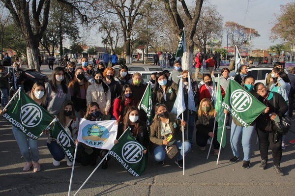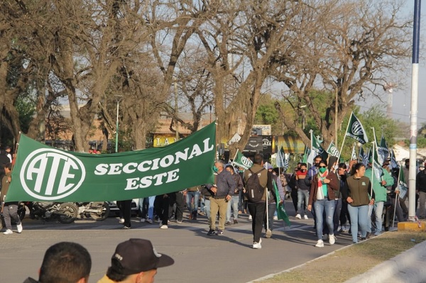 Los compañeros marcharon de forma pacífica desde frente del edificio municipal, estuvieron acompañados por la Secretaría Gral. Ely Maza y el Jorge Flores secretario General Adjunto de ATE Seccional Este, como así también por Daniel Coronel secretario General del SOEM, Julio “Kukino” Rocha Sec. Adj. del SOEM y el Mario Tito Aguirre, Sec. Adj. del S.O.E.M.