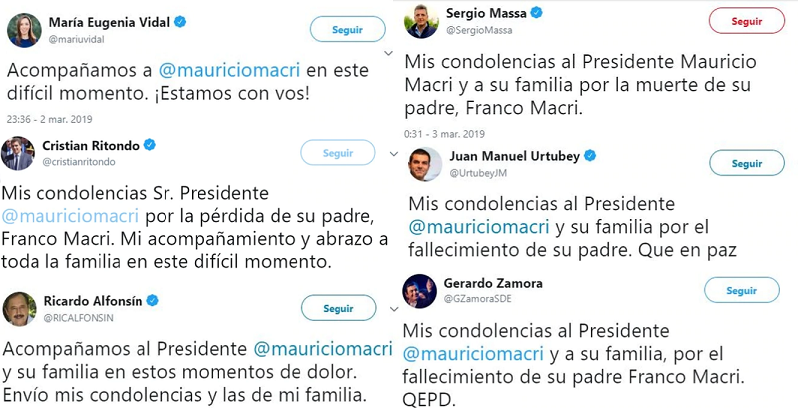 El ex gobernador de la provincia de Buenos Aires Daniel Scioli hizo lo propio y le envió un saludo afectuoso al mandatario: “Mis respetos y condolencias al Presidente Mauricio Macri y a su familia, por el fallecimiento de su padre Franco Macri. Los saludo con afecto”.
