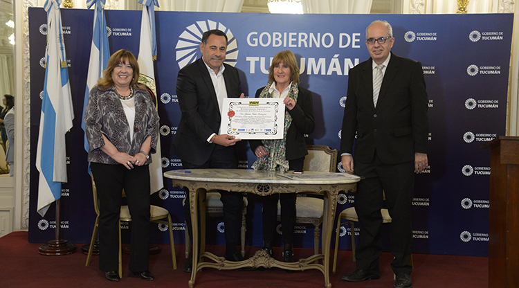 La secretaria general de la Gobernación, Silvia Pérez; el ministro de Gobierno y Justicia, Regino Amado, y la directora del Ente Cultural de Tucumán, Mercedes Aguirre, recibieron a una comitiva de la Asociación de Art Nouveau de Buenos Aires (AANBA), presidida por Juan Carlos Pastrana, que hizo entrega de una distinción a la Provincia por la conservación del Salón Blanco, que fue reconocido como el más importante de Latinoamérica por sus valores estéticos y arquitectónicos. Distinción que fue dirigida al gobernador, Juan Manzur