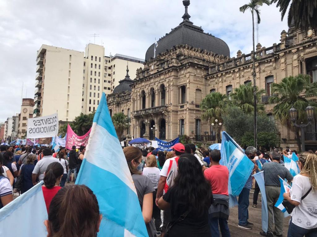 Los docentes que vienen reclamando condiciones sanitarias contra el covid 19 y una mejor suba salarial, se concentraron nuevamente en Casa de Gobierno para hacer sentir el malestar que el acuerdo firmado por el Frente de Gremios Docentes (FGD).