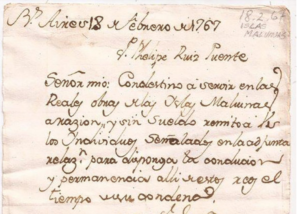 El segundo documento es una carta fechada en Malvinas el 25 de abril de 1767 enviada por el gobernador de Malvinas Felipe Ruíz Puente a su par bonaerense Bucarelli y Ursúa. En esa misiva le explica la necesidad de levantar una capilla en Malvinas “para todo el pueblo, pues solo se cuenta con una muy precaria, con una imagen de San Luis”. Y solicita a la vez “un pequeño sagrario o tabernáculo con su copón correspondiente y una imagen de la Advocación que V.E determinare para Patrono de esta posesión”. Cabe destacar que el Puerto Soledad se bautizó como Saint Louis cuando fue descubierto por los franceses. Sucede que las islas luego fueron transferidas a la corona española por Francia.