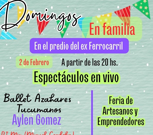 Este Domingo 2 de Febrero a partir de las 20 hs en el predio del ex ferrocarril, se vivirá la fiesta “Domingos en Familia”, actuarán Aylen Gomez, Ballet Azahares Tucumanos y DJ Mix (Miguel Córdoba).