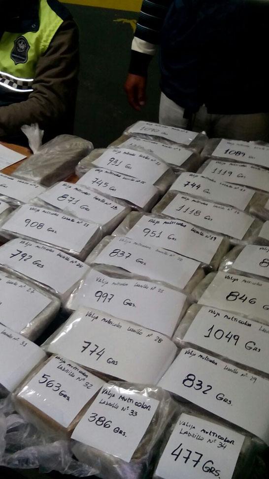 Por tal motivo la fuerza de seguridad reacción y advirtió al sujeto su presencia en el lugar por lo que inmediatamente el sospechoso se dio a l fuga, dejando tiradas las valijas. En principios se dudo sobre lo que podría haber dentro de esas maletas ya que todo era muy sospechoso. Podía ser ropa, droga o algún artefacto explosivo. Po lo que se pidió intervención a personal del destacamento policial de la Terminal y de la Guardia Urbana, a cargo de René Soria quienes al abrir el equipaje observaron que una estaba rota y en cuyo interior tenía 70 kilos de marihuana. El comisario principal, Jorge Nacusse, de la Digedrop, también participó del operativo y al respecto dijo que tienen indicios del posible sospechoso implicado en el ilícito.