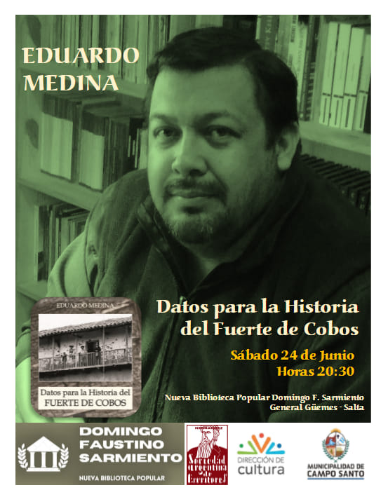 Letras de Fuego / Noticias / Presentación de libro. El próximo sábado 24 de junio, en la ciudad salteña de Güemes, se presentará el libro “Datos para la historia del Fuerte de Cobos”, del escritor e historiador Eduardo Medina.