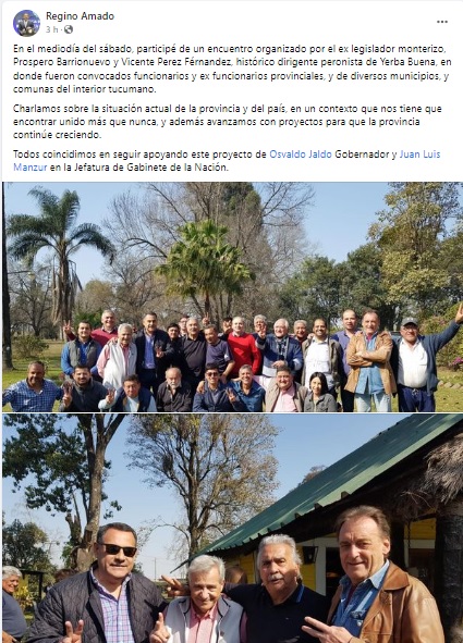 Al respecto, Regino Amado expresó en su cuenta de Facebook que “participé de un encuentro organizado por el ex legislador monterizo, Próspero Barrionuevo y Vicente Pérez Fernández, histórico dirigente peronista de Yerba Buena, en donde fueron convocados funcionarios, ex funcionarios provinciales, y de diversos municipios y comunas del interior tucumano”.