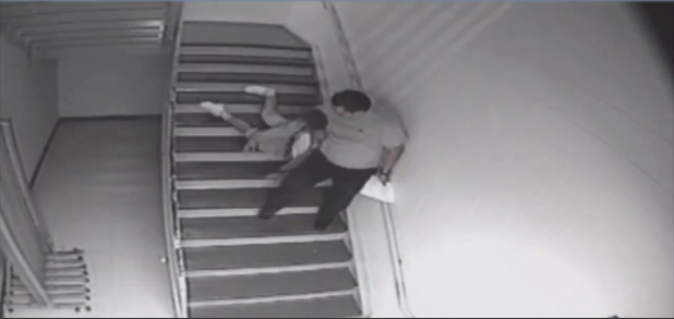 En el video se ve a Wilbert Delacruz, un profesor de física de 38 años que enseña en la escuela desde 2007, mientras le aplica una “llave de cuello” a su alumno: al principio el hombre pone sus brazos alrededor de las espaldas del joven, de 15 años, que no opone resistencia. Luego lo toma por el cuello y por la cintura y lo arrastra por las escaleras.