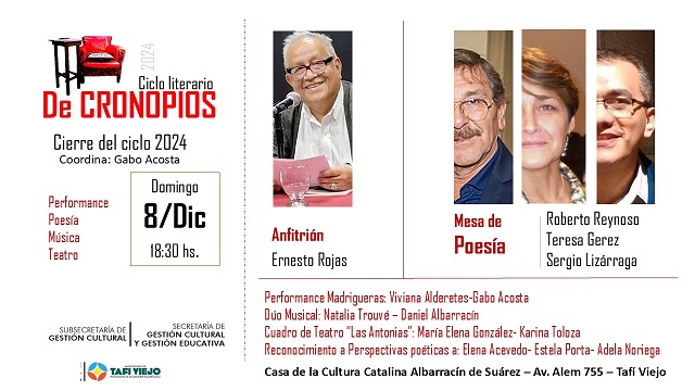 Letras de Fuego / Noticias. El próximo domingo 8 de diciembre será la actividad de cierre del año en el ciclo literario De Cronopios, organizado por el área de Cultura de la Municipalidad de Tafí Viejo y coordinado por Gabo Acosta.