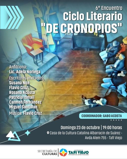 Más Cronopios que nunca / Literatura y música. Este domingo se desarrollará el 6º Encuentro del Ciclo Literario “De Cronopios”, coordinado por el escritor y artista visual Gabo Acosta, a las 19, en la Casa de la Cultura Catalina Albarracín de Suárez, en Tafí Viejo.