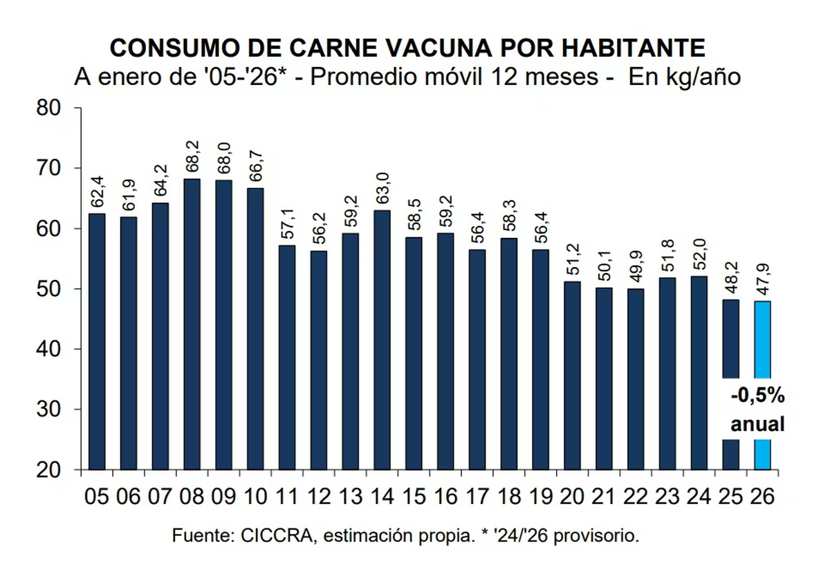 De acuerdo con el documento, el promedio móvil de los últimos doce meses del consumo por habitante se ubicó en 47,9 kilos/año al cierre del primer mes del año. Esta cifra representa una baja del 0,5% respecto al promedio registrado en enero de 2025 y consolida una tendencia decreciente que ha llevado este indicador a su punto más bajo en las últimas dos décadas.