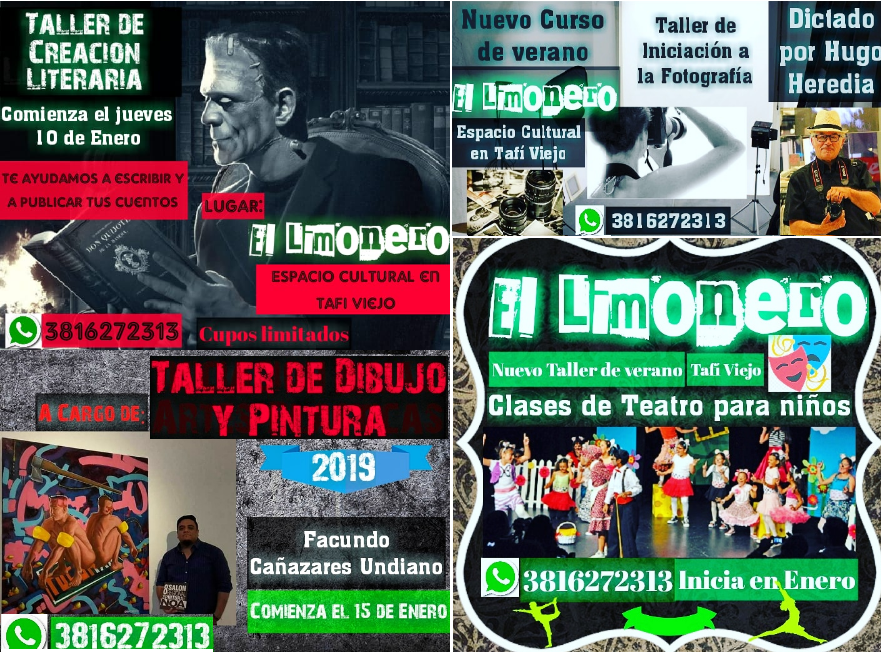 El Espacio Cultural “El Limonero” invita a a participar de los cursos de verano que se dictarán en su local ubicado en la ciudad de Tafí Viejo. Juan José Genisans, escritor a cargo del lugar, indicó que destacados artistas, como Hugo Heredia, dictará las clases de Fotografía; Facundo Cañazares Undiano la de dibujo y pintura; las clases de teatro para niños serán dictada por Lidia Barros, y las clases de escritura (Literatura) estarán a cargo del propio Genisans, quien además dictará clases de inglés.