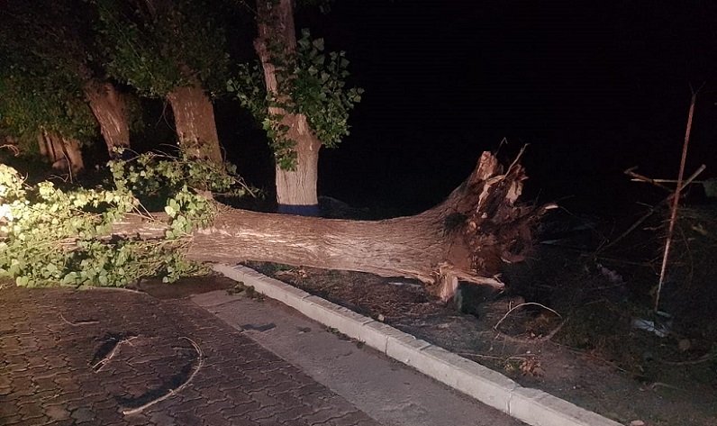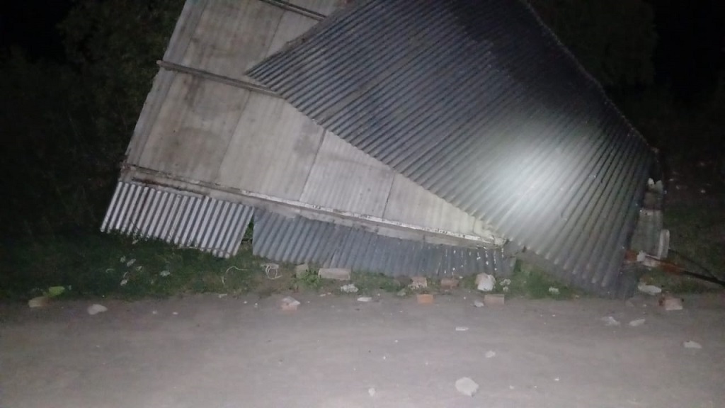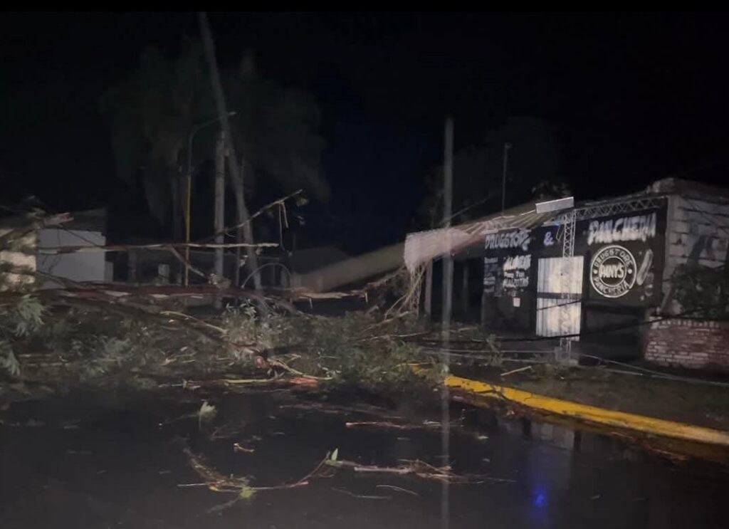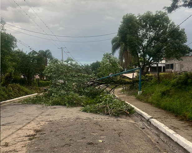 En calle 12 de Octubre, frente a la entrada del complejo municipal, se constató la caída de un árbol de gran tamaño, obstruyendo la totalidad de la calzada produciendo caída de los cables de alta tensión, y rotura en una galería donde funciona un Kiosco, solo daños materiales.