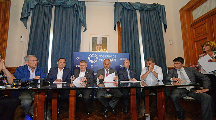 Acompañado por el vicegobernador, Osvaldo Jaldo; los ministros de Gobierno y Justicia, Regino Amado; de Educación, Juan Pablo Lichtmajer; y de Interior, Miguel Acevedo, el Primer Mandatario rubricó el acta con el Frente Gremial Docente, representado por David Toledo, de la Asociación Tucumana de Educadores Provinciales (ATEP); Edgardo Bessone, de la Asociación del Magisterio y Enseñanza Técnica (AMET); e Isabel Ruiz, por la Agremiación del Personal de Enseñanza Media y Superior (APEM).