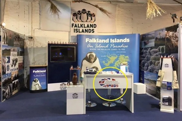 En ese espacio apareció un escritorio con la leyenda “Falklands Islands” y distintos folletos informativos que fueron repartidos entre los asistentes.