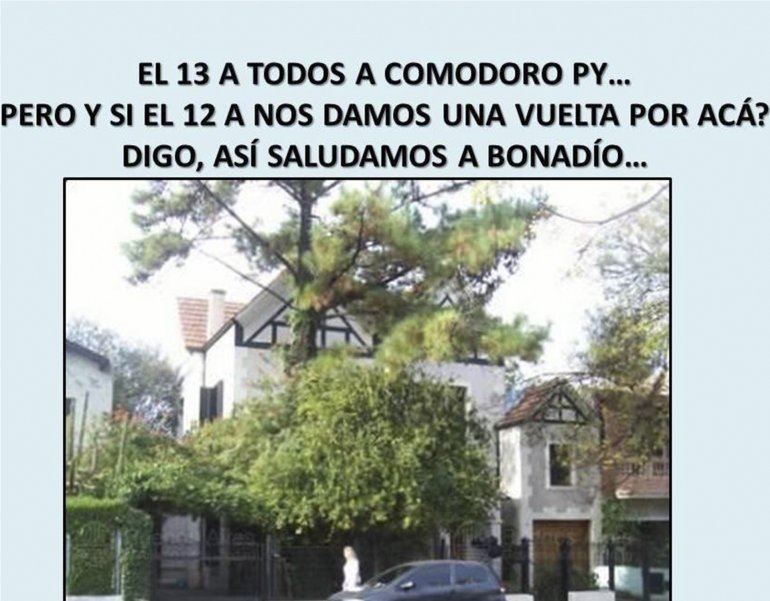 “Bonadío (sic) estás?”, es el título del posteo publicado en el blog Memoria, Identidad y Resistencia. Allí, se incorporó una imagen de la casa del juez federal, con dirección, a la que convocan a un acto de repudio. “El 13 A todos a Comodoro Py… Pero si el 12 A nos damos una vuelta por acá? Digo, así saludamos a Bonadío (sic)…”.