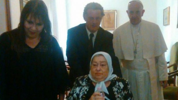 El papa Francisco recibió este mediodía (la tarde de Roma) a la jefa de las madres de la Plaza de Mayo, Hebe de Bonafini, en una reunión privada en Santa Marta, la residencia personal que el sumo pontífice tiene en el Vaticano. La referente en Derechos Humanos llegó en silla de ruedas junto a un reducido grupo de colaboradores.