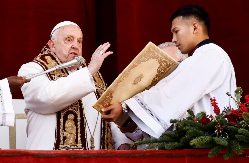 El papa Francisco pidió este miércoles en su mensaje de Navidad que callen las armas en Ucrania y se “tenga la audacia de abrir negociaciones para una paz justa” y que en Gaza “cese el fuego, que se liberen los rehenes y se ayude a la población extenuada por el hambre y la guerra”.