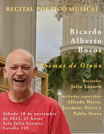 Letras de Fuego / Noticias. Los recitales poéticos organizados por la Camerata Lazarte, tendrán como protagonista poético al escritor Ricardo Bocos y su obra “Poemas de Otoño”, este sábado 18 de noviembre, a las 21, en la Sala Julio Lazarte, de Lavalle 145.
