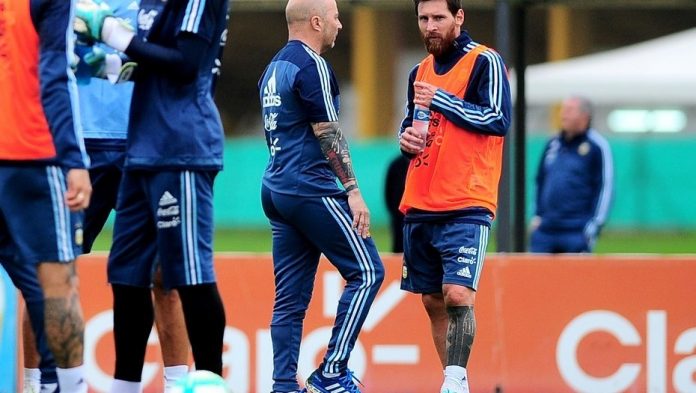 Sampaoli y Messi en el entrenamiento de la Selección Argentina, en Ezeiza. (Foto: Germán García Adrasti).