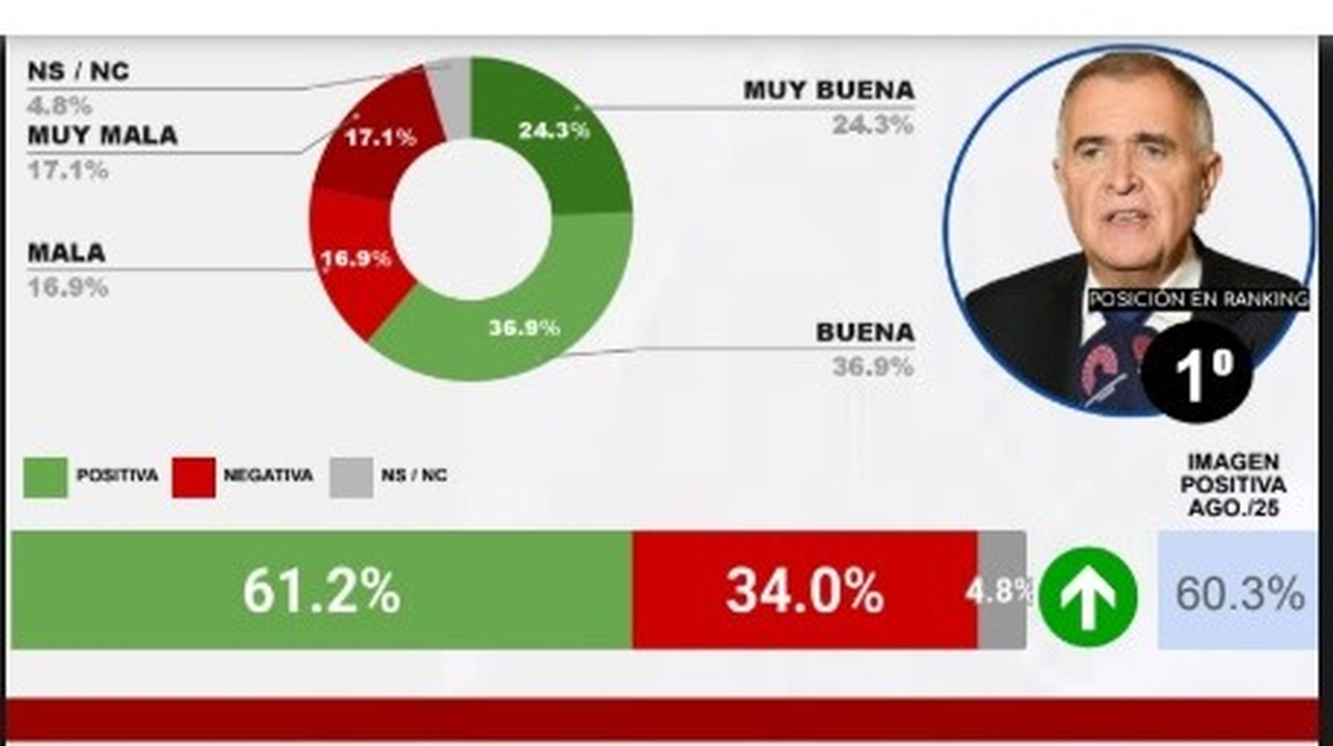 CB Consultora Opinión Pública publicó su habitual ranking de gobernadores. El primer mandatario de Tucumán, Osvaldo Jaldo, lidera el podio con un 61,2% de imagen positiva.