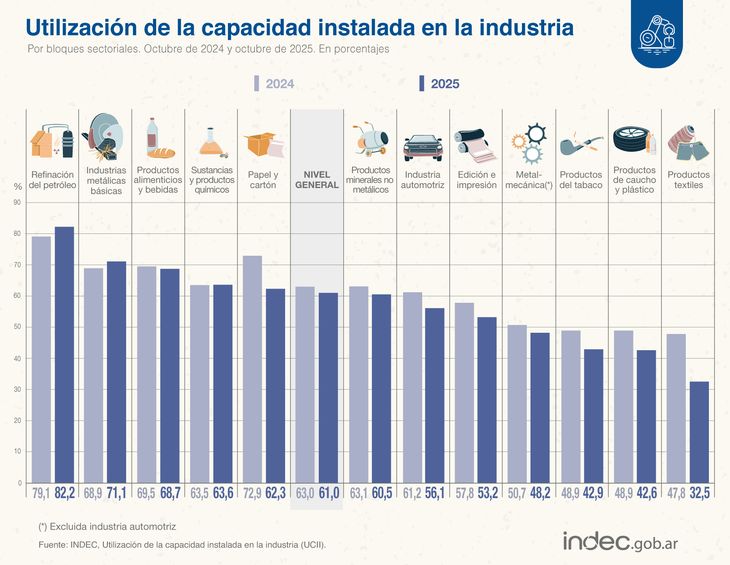 La capacidad instalada de la industria cayó al 61% en octubre frente al 63% que alcanzó en 2024, con sectores como el textil en torno al 32,5%, muy por debajo del promedio, según informó este viernes el Instituto Nacional de EStadística y Censos (INDEC). No obstante, es el segundo mes consecutivo de 2025 en el que este indicador se mantiene por encima del 60%, ya que en septiembre se ubicó en el 61,1%.